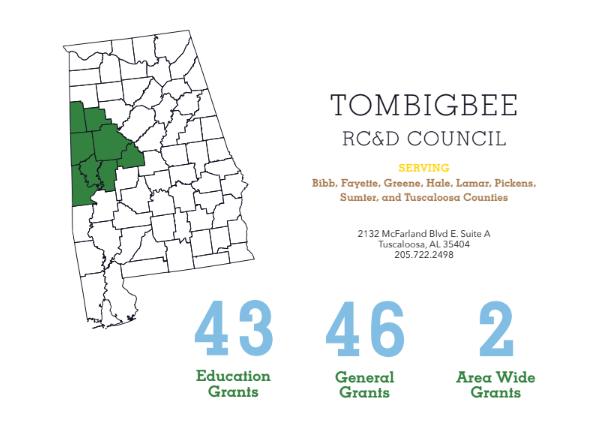 Tombigbee RC&D Council is a 501(c)(3) nonprofit working to enhance the environment and quality of life, and foster economic and community growth within Bibb, Fayette, Greene, Hale, Lamar, Pickens, Sumter, and Tuscaloosa Counties.